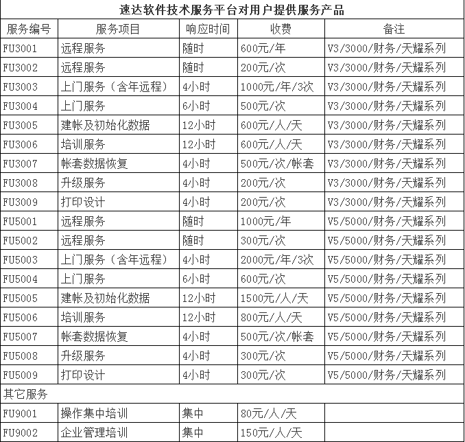 购买速达软件享受一年时间内在线远程远程维护服务。其它服务应以《服务协议》内容为准!运行维护服务只针对速达软件提供服务,非速达软件销售的操作系统,数据库系统,硬件,网络系统安装及病毒清理等软、硬件问题均不在服务范围内,另签协义除外。
