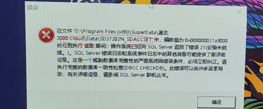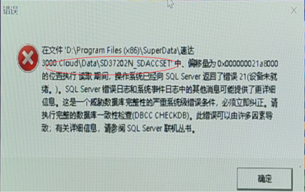 问题描述:速达3系服务器端服务启动时出现错误:在文件‘D:\Program Files\SuperData\速达\Data\SD37202N_SDACCSET'中.偏 移量为0X000000021a8000的位置执行读取期间,操作系统已经向SQLServer返回了错误21(设备未就绪)