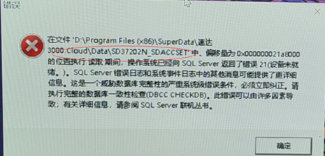 3000.Cloud\Data\SD37202N_SDACCSET'中.偏移量为0X000000021a8000的位置执行诚取期间,操作系统已经向SQLServer返