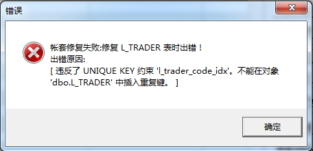 问题描述: 帐套修复失败:修复 L_TRADER表时出错!